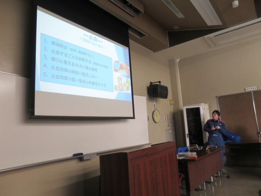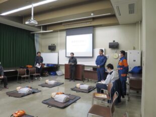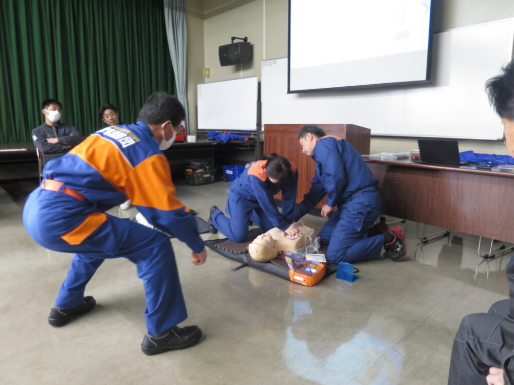 当日は、高松市消防局の職員の方々を講師としてお迎えし、心肺蘇生法やAEDの使用方法など、緊急時に必要となる応急手当について実技を交えながらご指導いただきました。